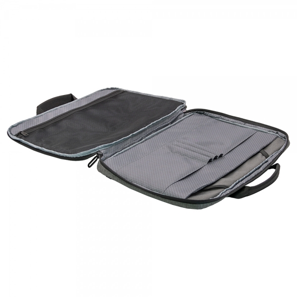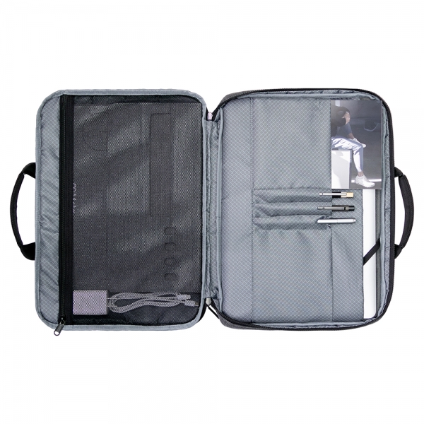 This laptop bag is a versatile, multi-functional carrier that transforms into three modes: handheld, shoulder, and crossbody. Made from recycled PET bottles, it features a spacious main compartment and a padded sleeve that fits a 16 inch laptop, along with multiple pockets for your tablet, phone, charger, cables and more. Durable and water/stain-repellent touring fabric protects your belongings from scratches, spills, and shocks, making this bag ideal for travel, work, or everyday use. Made from 7 recycled PET bottles
