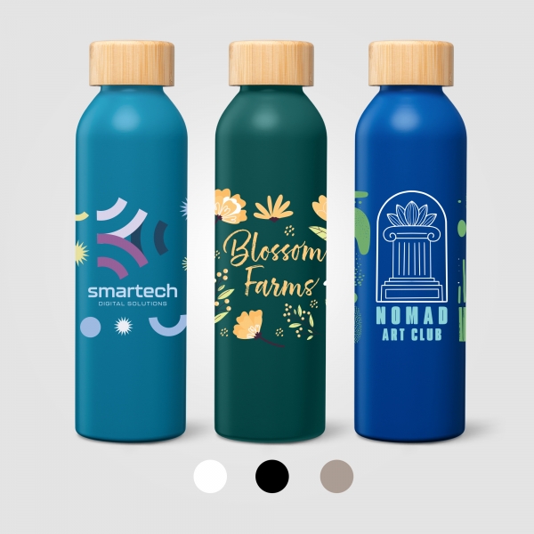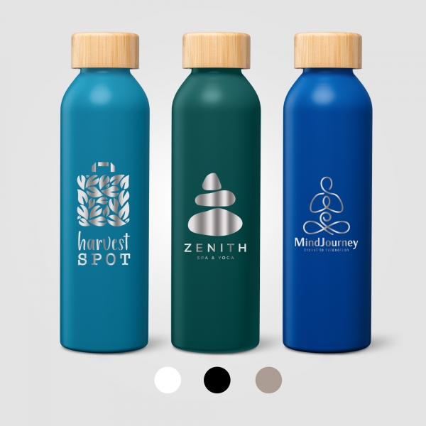 Our Eden Recycled Stainless Steel Bamboo Lid Water Bottle - 590 ml is perfect for clients seeking to promote consciousness. The lightweight single-wall bottle is made from recycled 304 stainless steel and features a screw-on, leakproof lid with an FSC-certified bamboo top. A matte finish provides a clean, modern backdrop to showcase a message, logo, and more. Suitable for cold drinks only. BPA free and FDA approved.