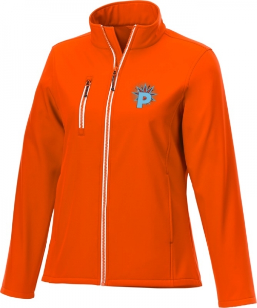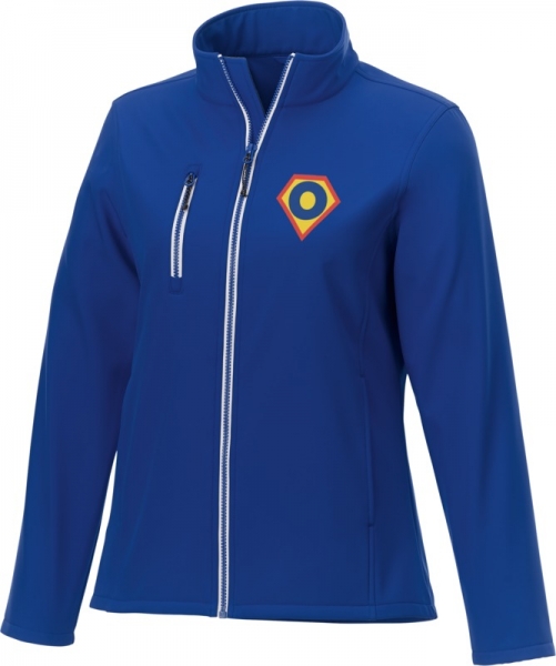 Orion women's softshell jacket. Interior custom branding options.Tearaway-cutaway main label for tagless comfort.Chest pocket with zipper closure.Front pockets.Shaped seams and tapered waist for flattering fit.Inner placket.Hanger loop. Mechanical stretch woven of 100% Polyester bonded with 100% Polyester micro fleece. 250 g/m².