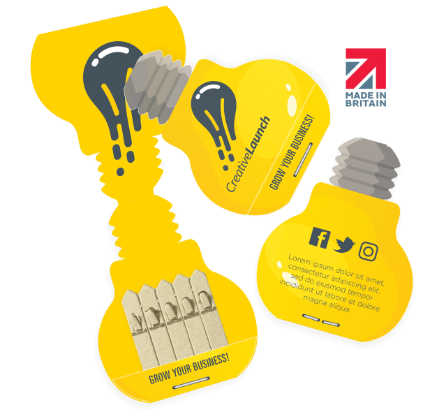 Light Bulb Seedsticks - this registered trademarked product evolved from a matchbook over 30 years ago with the striking end being replaced by seed! Seedsticks can be printed full colour, inside and out, using veg and soy inks on FSC certified paper. The product is Made in Britain certified with a wide range of flower, vegetable, herb and tree seeds available. Tear it, plant it and watch it grow.