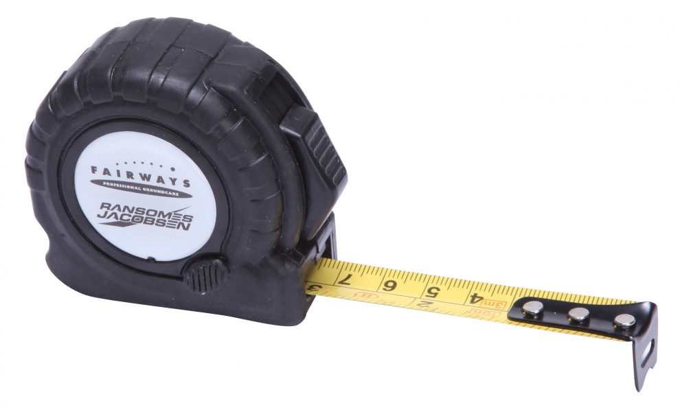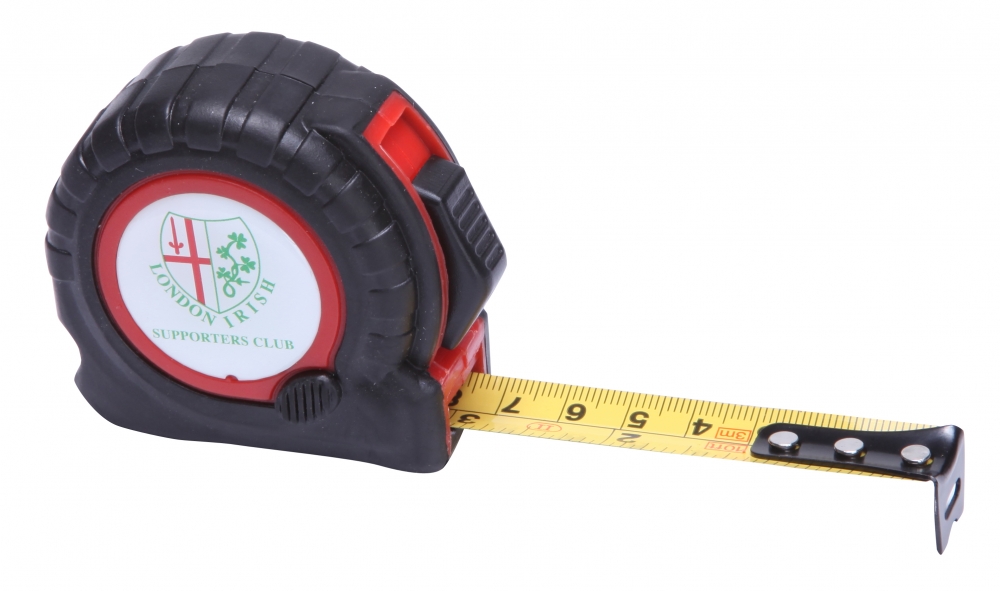 3m/10ft professional quality tape measure with an ergonomic grip and shock proof case. Printed on a deluxe dome label.