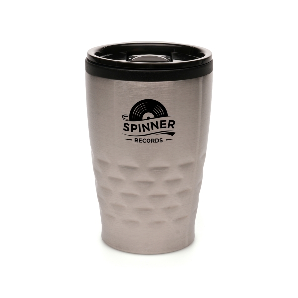 360ml double walled stainless steel tumbler with a sleek indented design to aid grip, black PP plastic inner and secure push on black AS plastic lid with sliding sipper. Conforms to articles in contact with food testing. BPA and PVC free.
