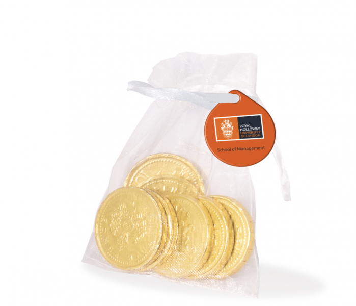A white Organza Bag filled with large foil wrapped Chocolate Coins. Branded with a full colour card tag.