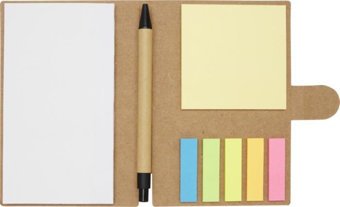 The Swift sticky notes booklet with ballpoint pen is a very handy office essential, with 25 sheets of white 70 g/m2 blank paper (14.1 x 7.8 cm). It also has small (4.5 x 1.2 cm) and big (7.5 x 7.5 cm) coloured sticky notes. The barrel of the ballpoint pen is made of recycled paper. Ink colour: Black. Writing length: 500 metres. Nib size: 1.00 mm. FSC certified paper. FSC Mix Credit P7.1 CU-COC-877277.