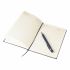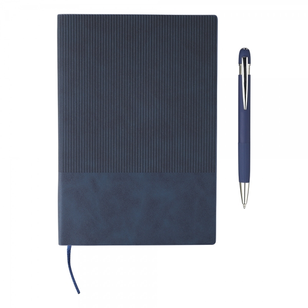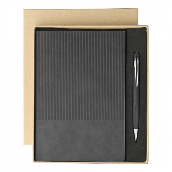 Recycled PU notebook and ballpen. The notebook has a corduroy-look finish on the top part of the front and back and includes a ribbon marker and 100 lined pages of 80gsm paper and features an embossed recycled logo on the back. The ballpen has a rubberized finish and laser-engraved recycled logo. Packed in a strong brown carton box with EVA inlay.