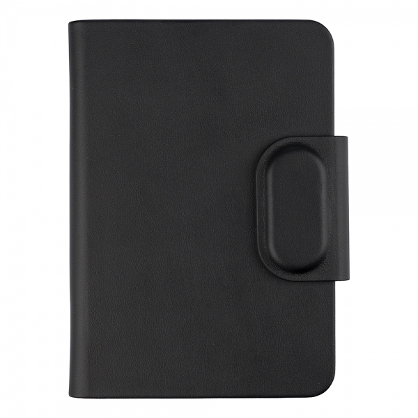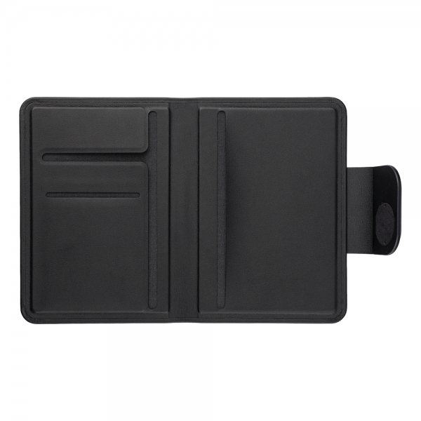 Recycled PU hardcover passport holder with magnetic closure and built-in Apple, FindMy tracker embedded in the flap. Features three internal pockets for organizing documents and cards. Individually packaged in a kraft paper box.