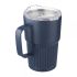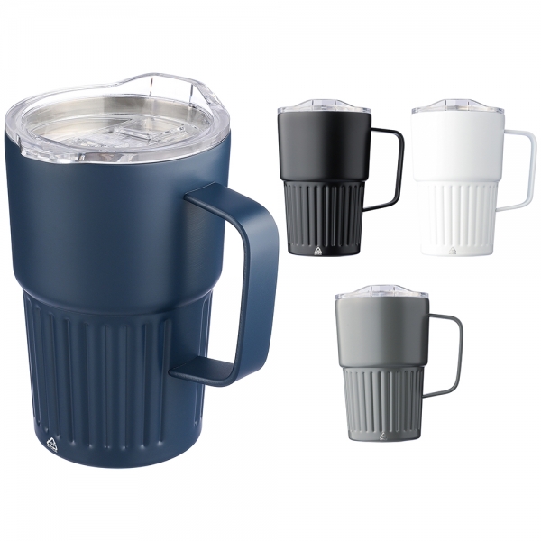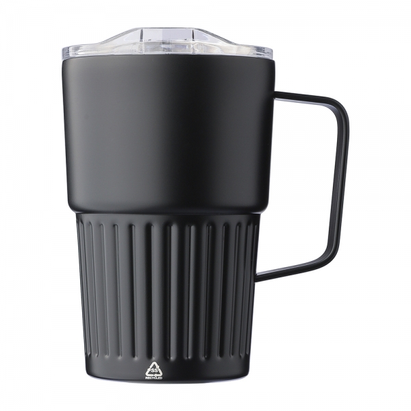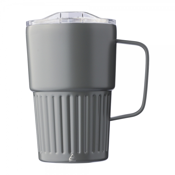 Recycled stainless steel drinking mug (450 ml) with a slide closure lid. Includes an engraved recycled logo on the body. Individually packaged in a brown cardboard box.
