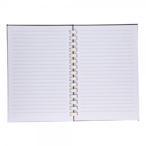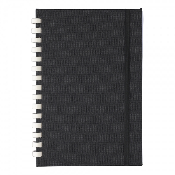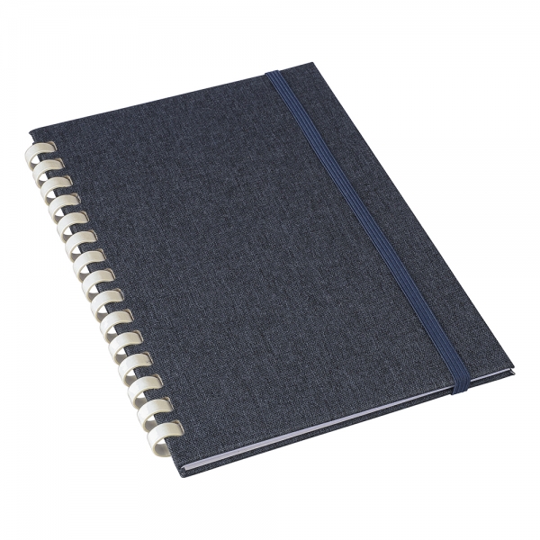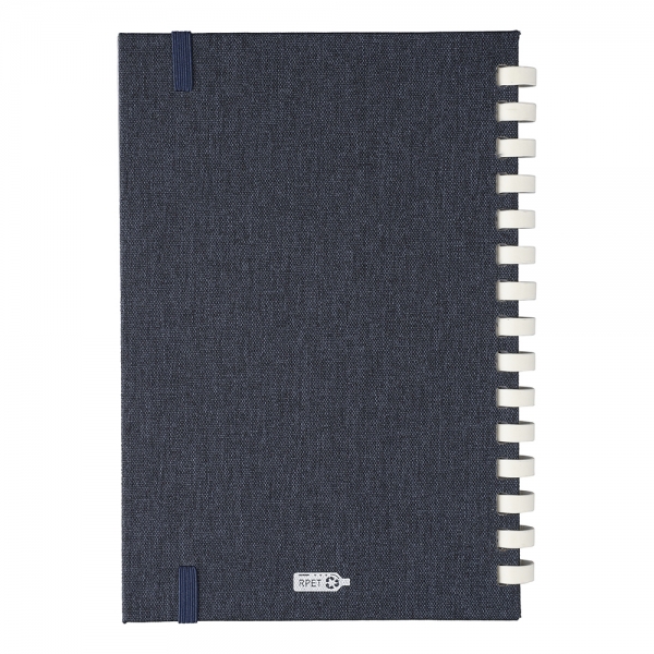 RPET notebook with a hard cover and elastic closing band. Features a white cardboard spiral binding, ribbon marker and 80 sheets of 70gsm lined paper. Includes an rPET logo on the back.