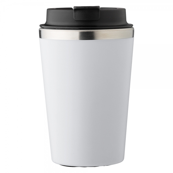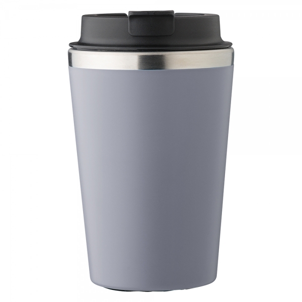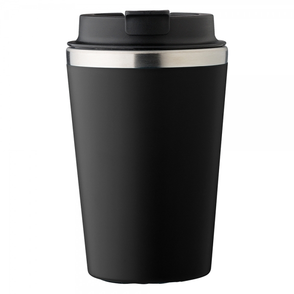Stainless steel travel mug (350 ml). The lid has a silicone closing ring with a foldable closure on top. Individually packaged in a brown cardboard box. The inside is double walled plastic.