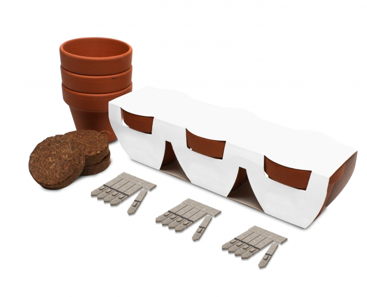 A seed grow kit containing 3 terracotta clay pots, each come with a soil tablet and 5 Seedsticks®. These kits are designed to easily grow plants at home or work. Customisable full-colour digital print on the sleeve.