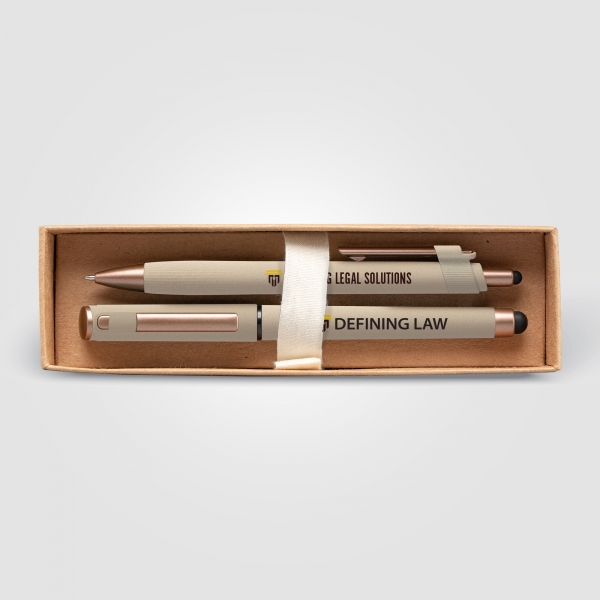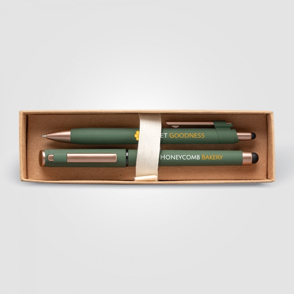 Discover the Bronze Trim Pen Set with FSC Gift Box—a refined writing duo that blends elegance with responsibility. This set features a gel pen with cap and a retractable ballpoint pen, both crafted with a unique stone-like texture and accented with warm bronze trim. The entire set, including the recyclable FSC-certified kraft paper gift box, is beautifully decorated with vibrant full-colour inkjet printing. The ALM cap gel pen offers smooth ink flow, while the ALN retractable ballpoint pen ensures crisp, reliable writing. This duo is perfect for holiday programmes, or elevated promotional campaigns, this duo delivers a premium writing experience in a stylish presentation.